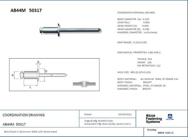 The AB44M is a blind rivet in aluminium with dome head and a mandrin (nail) in steel.
