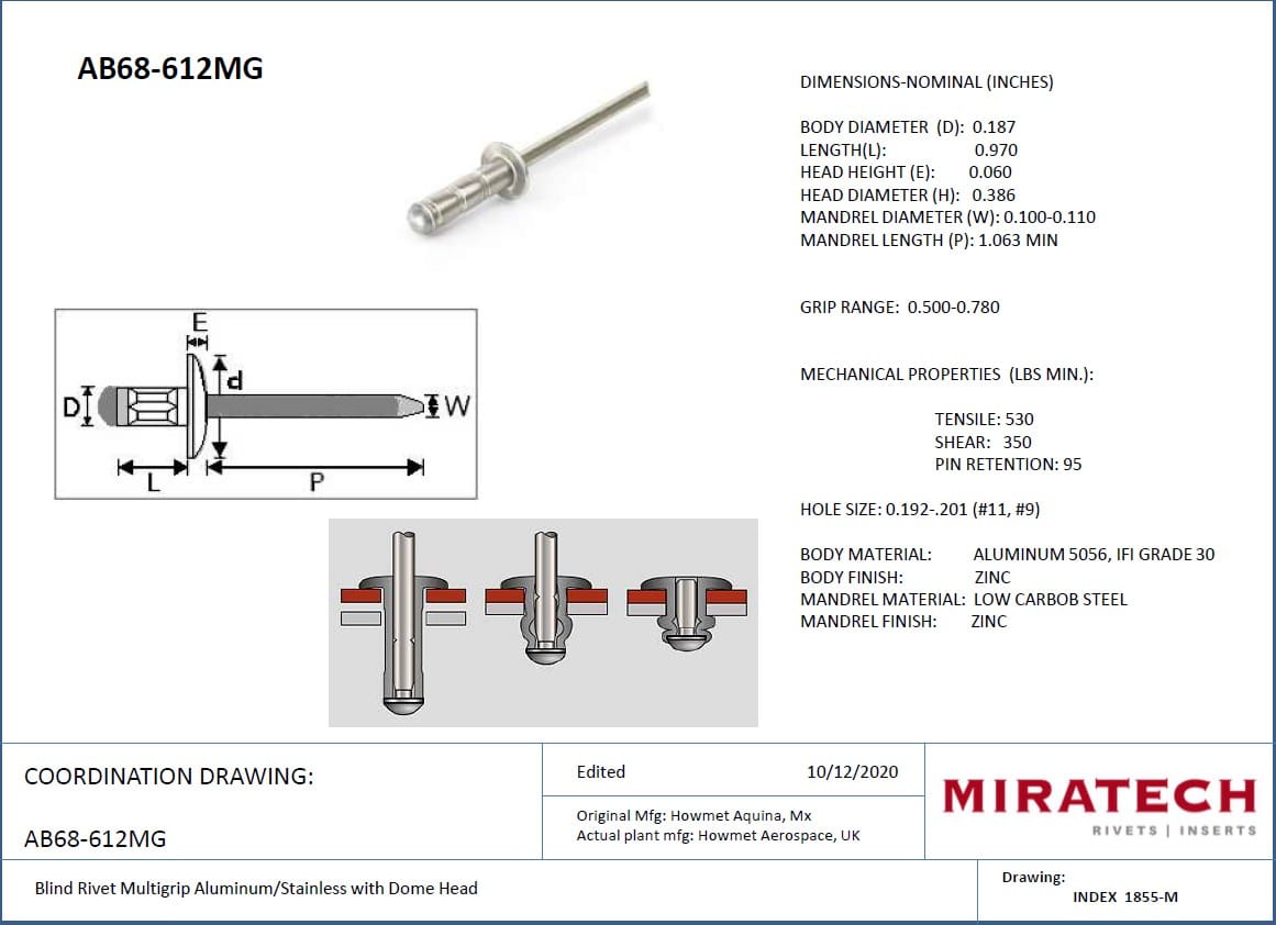 The AB68-612MG is a multi grip blind rivet with a dome head of aluminium and a mandrin (nail) of steel.