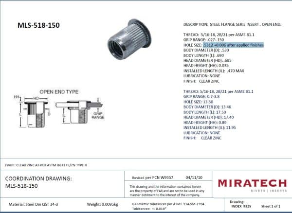 Hole size: 0.531 + 0.006 after applied finishes