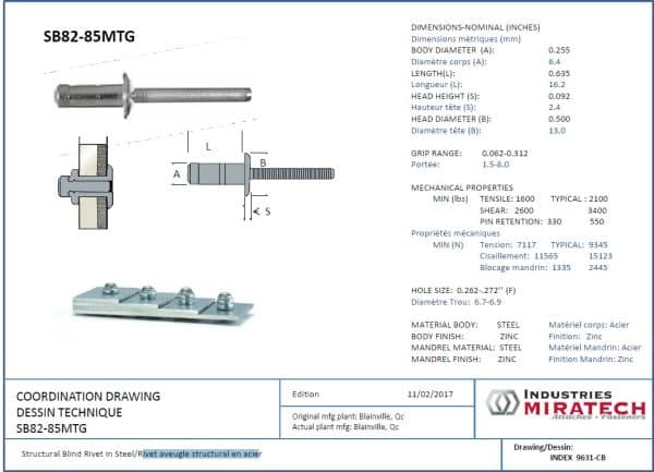 The SB82-85MTG is a structural blind rivet made in steel with a dome head.